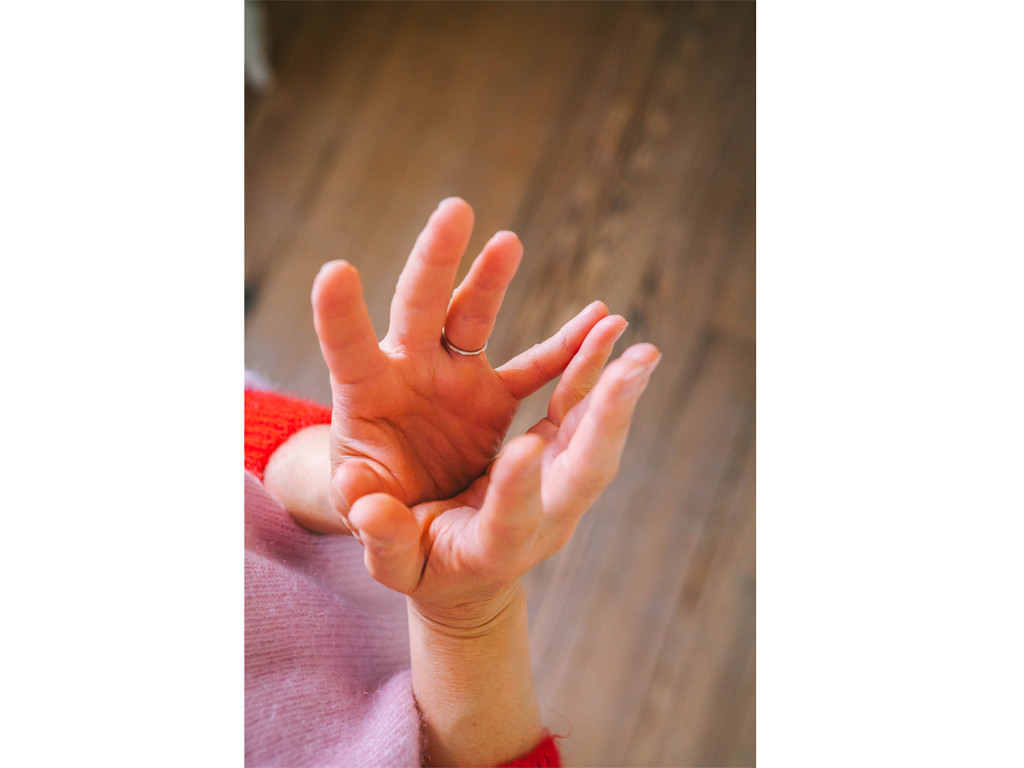 Écartez les doigts le plus possible, tout en respirant profondément et doucement. Maintenez cette posture pendant 36 respirations, en relâchant les épaules.
