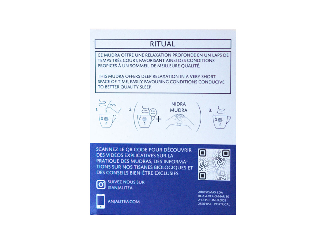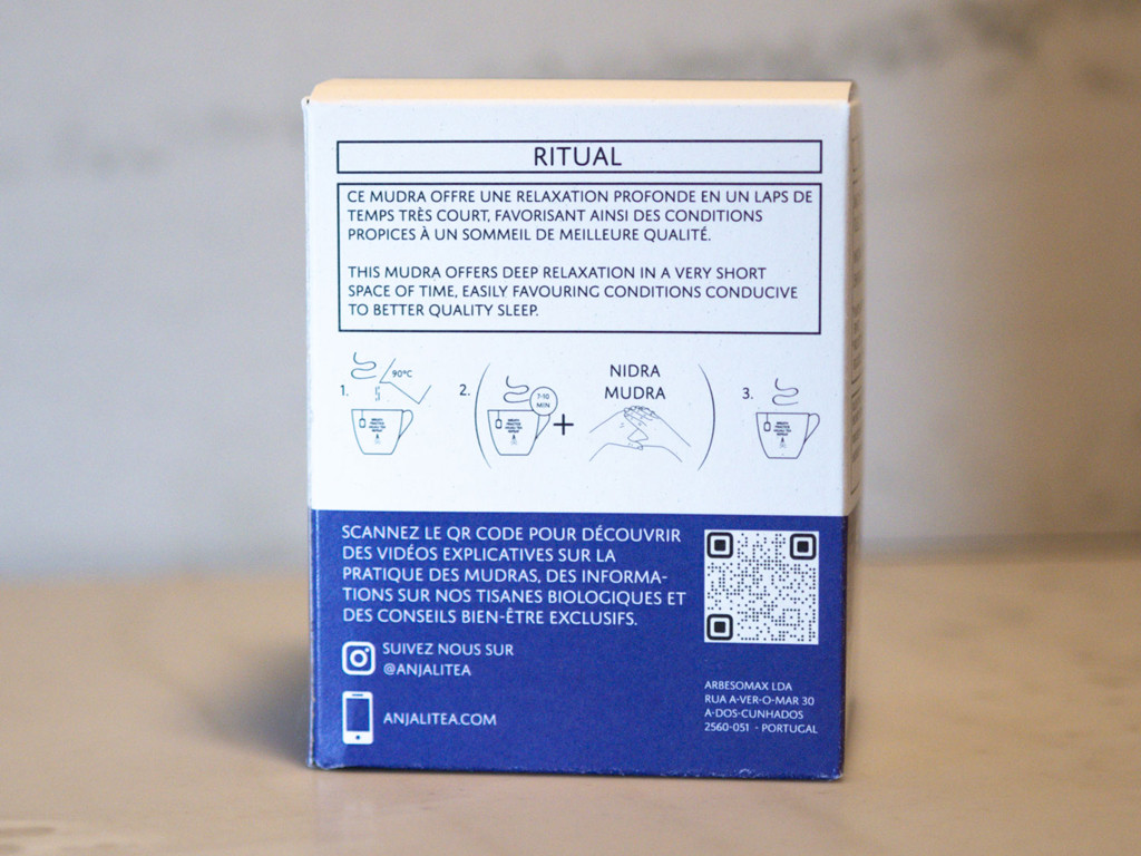 Découvrez "Sweet Dreams" d'Anjali Tea, une tisane réconfortante. Composée d'ingrédients biologiques tels que la marjolaine, la mélisse, la citronnelle, le tilleul et la verveine, elle favorise un sommeil de meilleure qualité. Associée au Mudra de relaxation, elle permet de se détendre profondément en un temps record. Plongez dans un sommeil paisible. Profitez de la tranquillité ce soir !